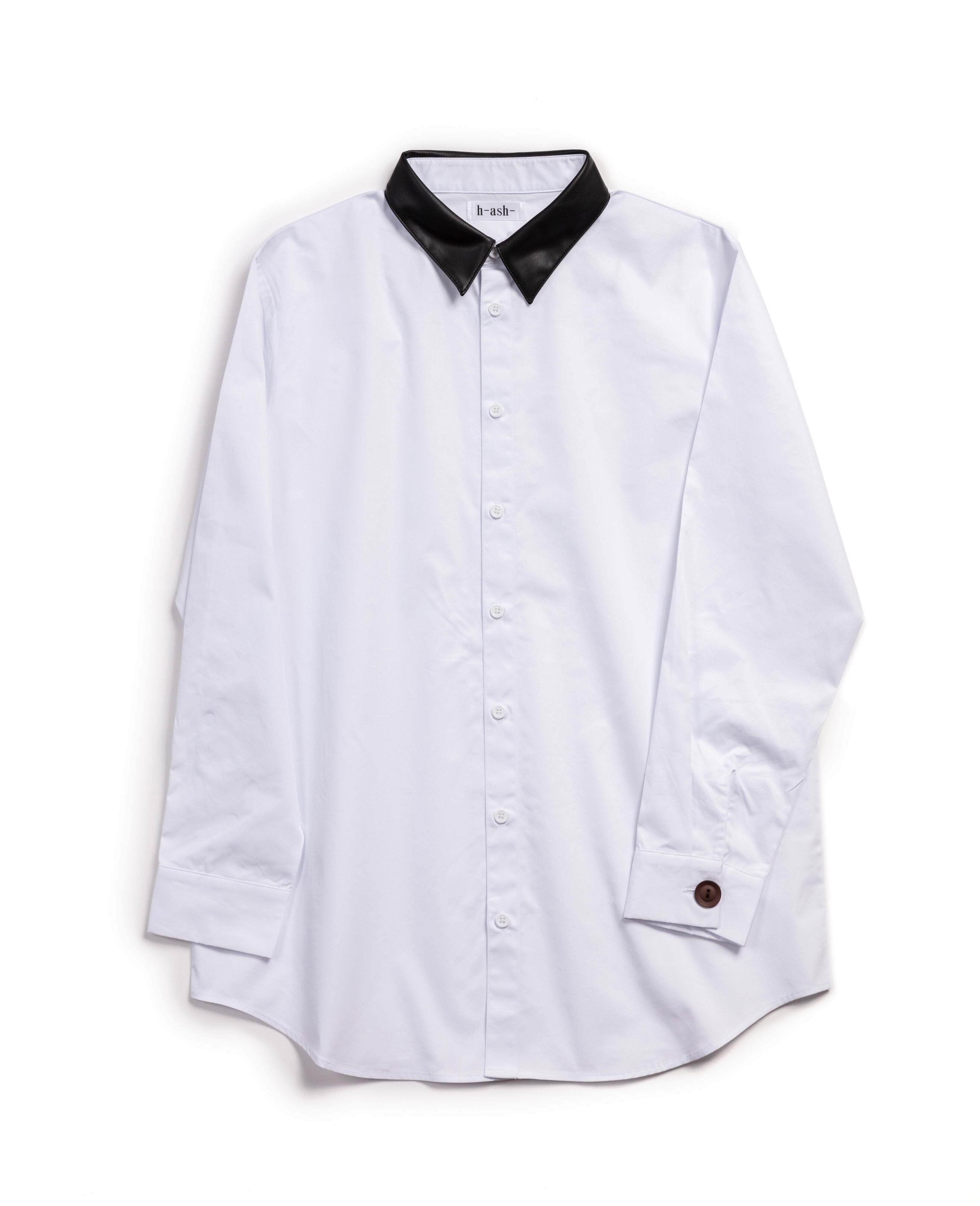 襟レザー袖大きめボタンバックプリントブラウン白シャツ
