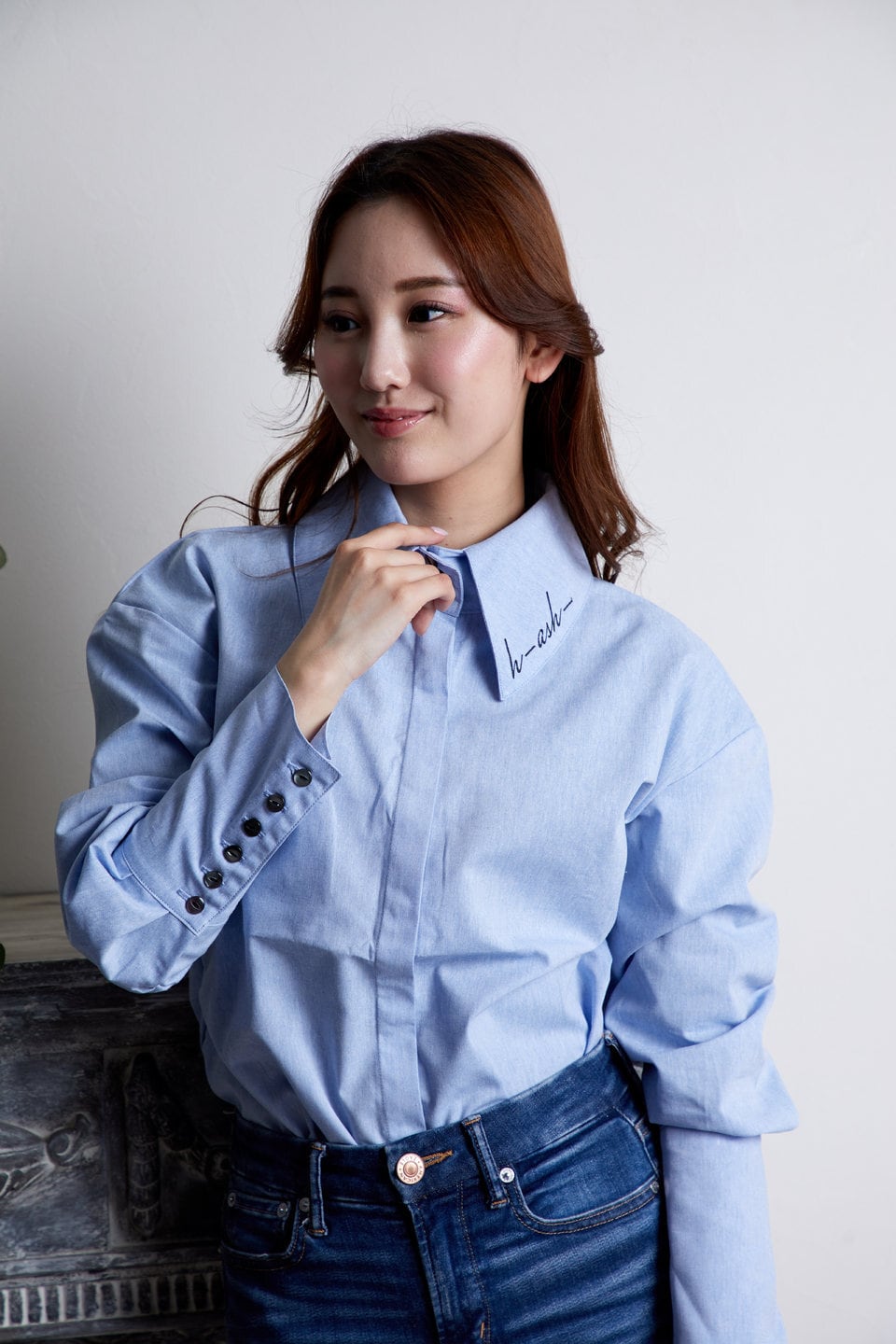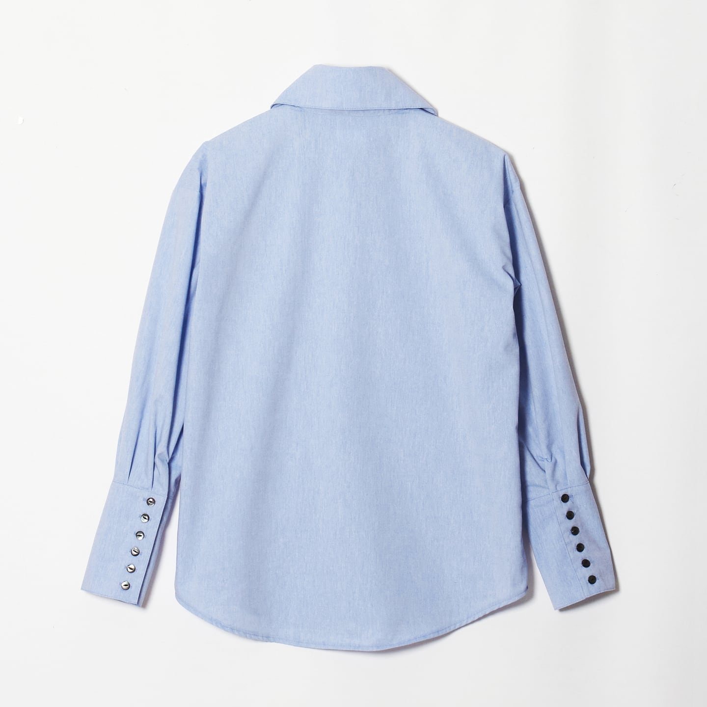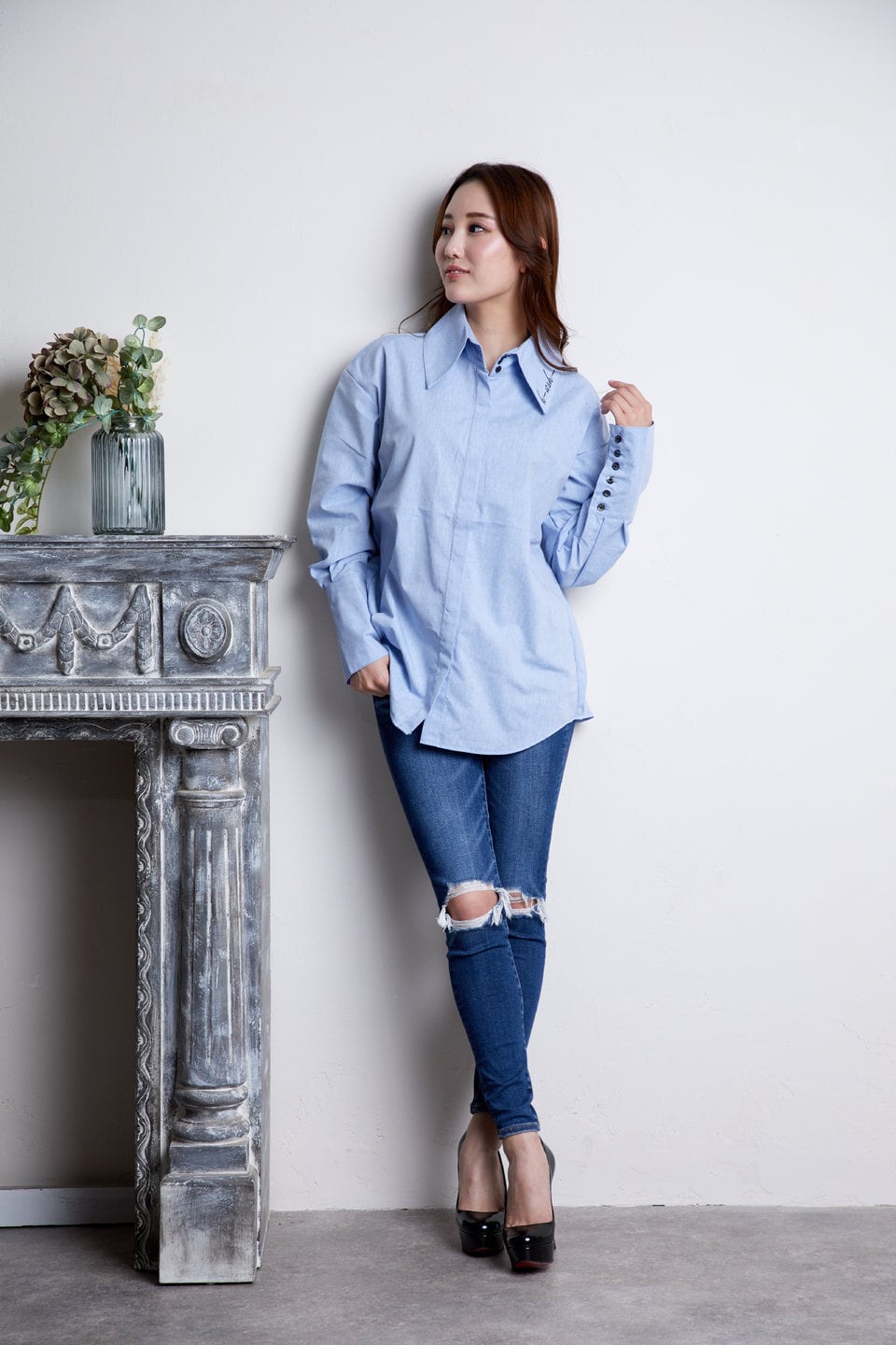 刺繍で立体的にしたロゴは、比翼仕立てで装飾を抑えたシャツの中にで目を引くアクセントに。