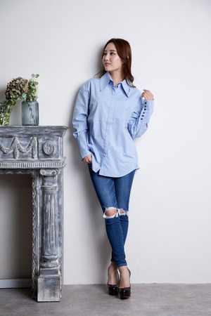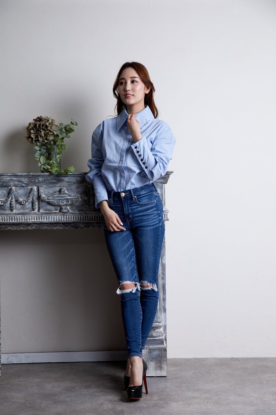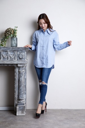 ボタンを留める事でドレッシーにも、折り返す事でカジュアルな装いにもなるアレンジしやすいディテールで